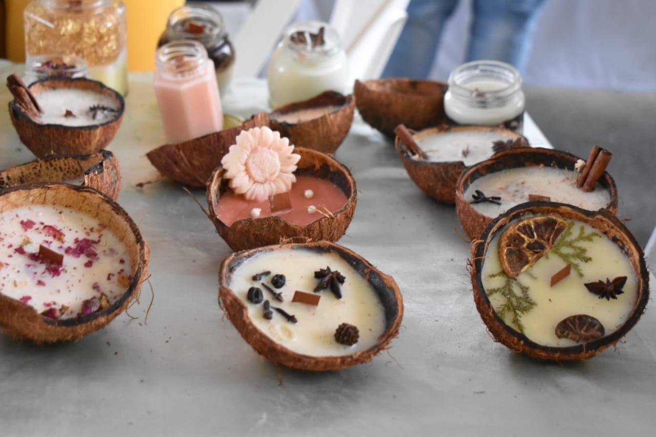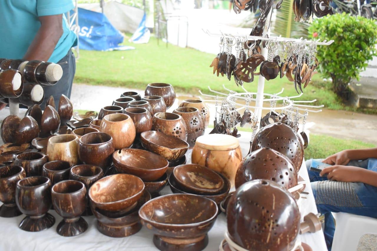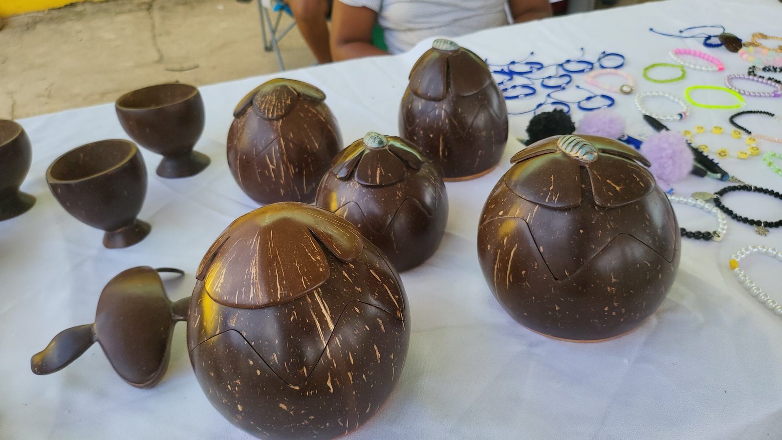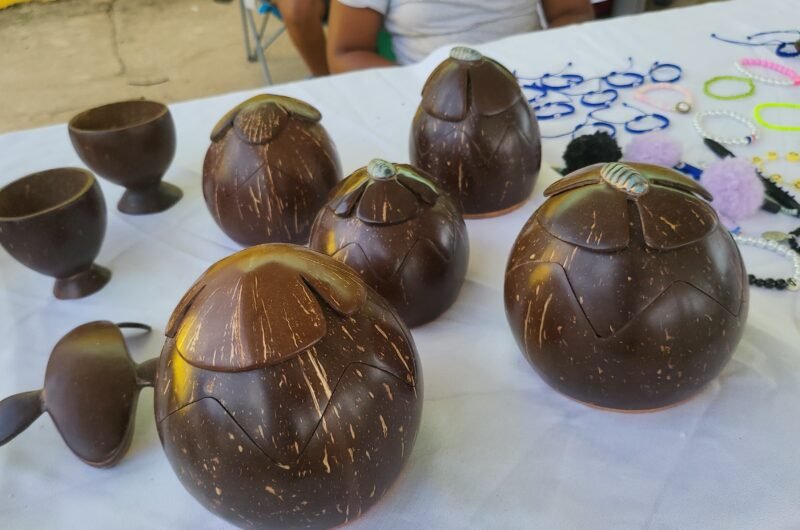 Exhibición de artesanías hechas con jícara de coco y charlas sobre siembra, cuidado de palmeras y sostenibilidad ambiental.